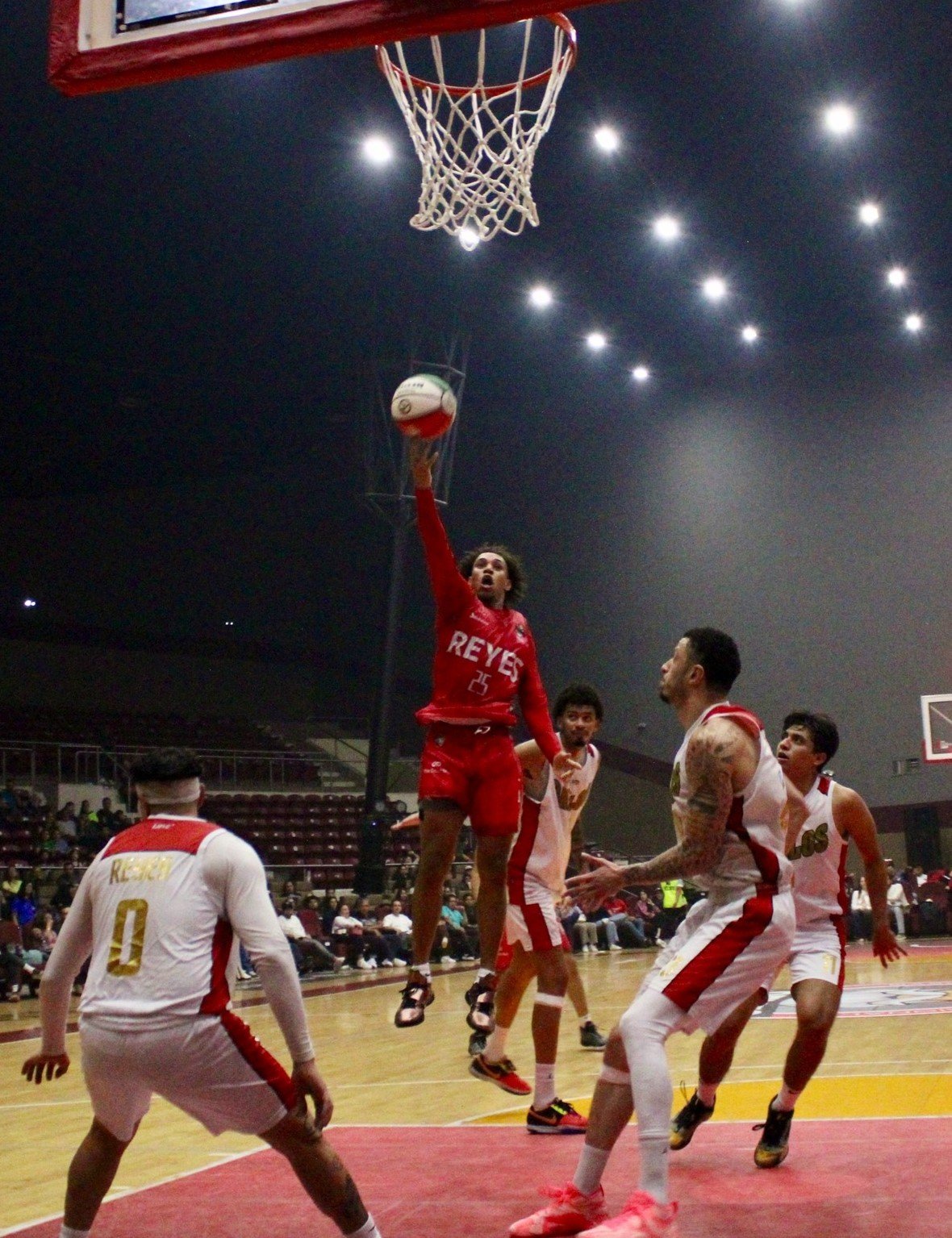 Los dirigidos por Joel Ortiz inició con intensidad, mostrando una defensa férrea y un ataque contundente que sorprendió a los visitantes. Con la quinteta inicial formada por Jorge Chávez, Brandon Reyna, Dillon Smith, Alex Holcombe y Ulises Ortiz, Reyes se fue al frente con un claro 21 puntos por 9. La Monarquía mantuvo el dominio en el segundo periodo, ampliando la ventaja hasta por 40 puntos a 27 al medio tiempo. Hasta ese momento, Brandon Reyna había anotado 9 puntos, seguido de Smith y Holcombe con 8 cada uno. Por Gallos, Óscar Calvillo aportó 9 tantos y Luis Ochoa sumó 4.