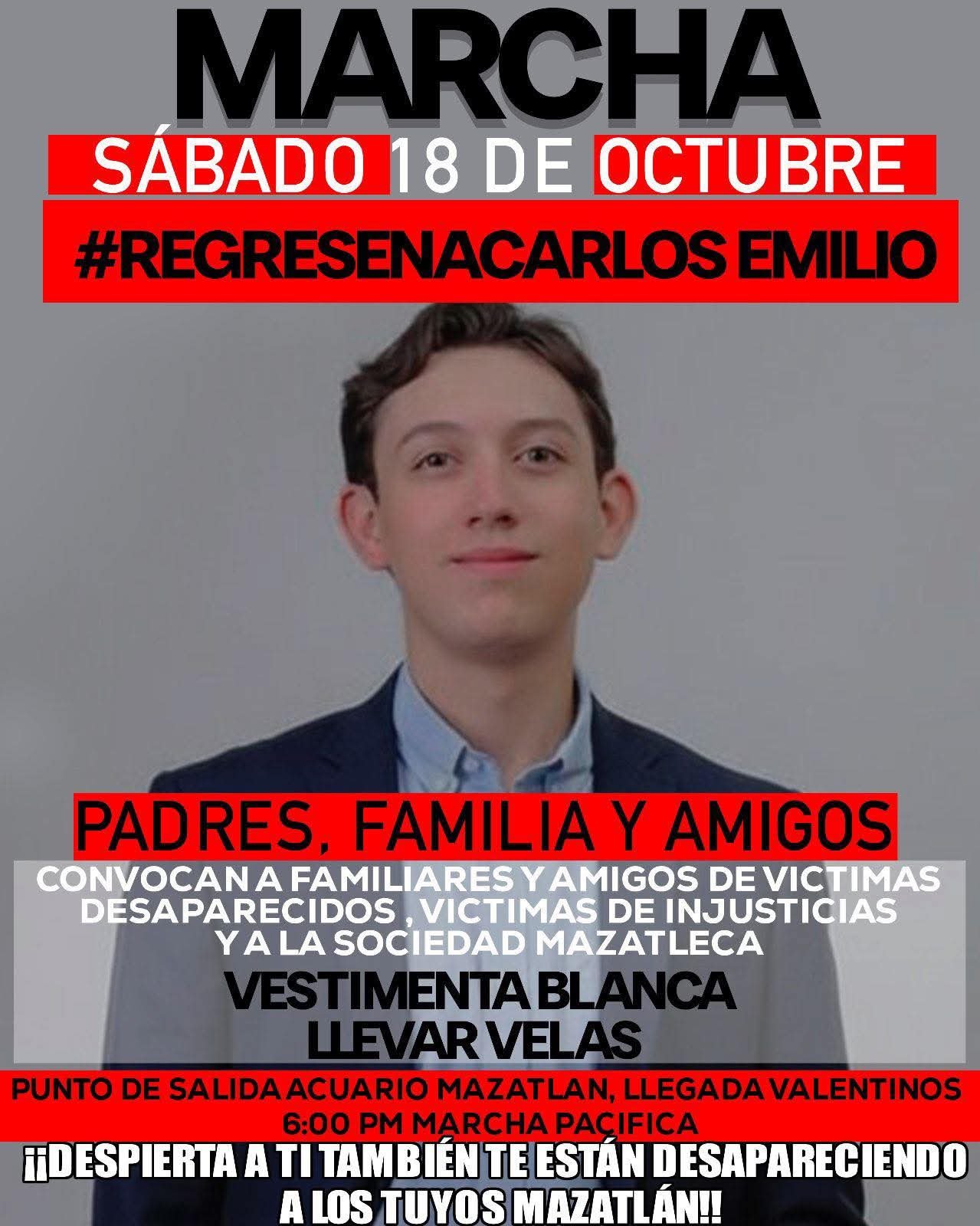 Ante la complejidad de la situación, Brenda no pierde la esperanza de volver a abrazar a su hijo y pide el apoyo de todos para que su historia no quede en el olvido. A través de sus redes sociales, la madre de Carlos Emilio dio a conocer que el próximo 18 de octubre se llevará a cabo una nueva marcha, pero esta ocasión será en Mazatlán, Sinaloa en punto de las 6 de la tarde, partiendo desde el Acuario Mazatlán para finalizar en el Bar Valentino Terraza.