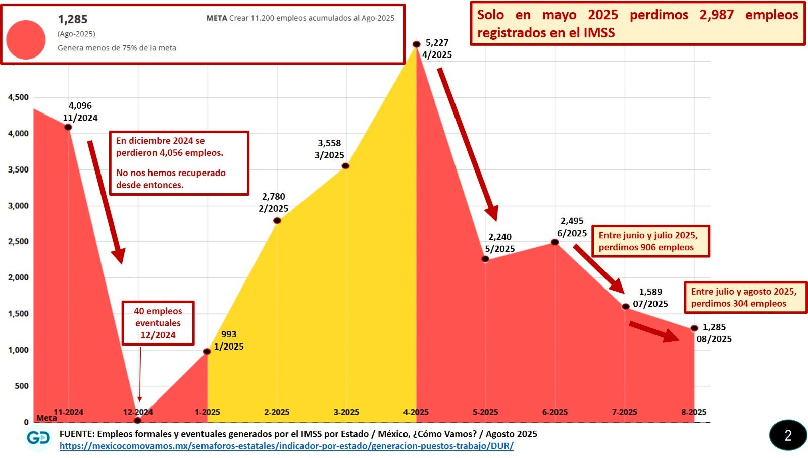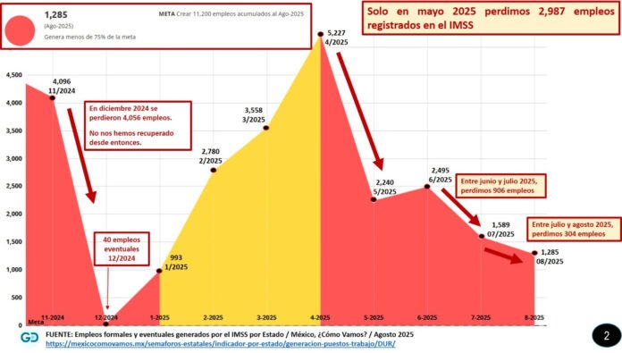 Sara Valenzuela / La Voz de Durango. La generación de empleo formal en el estado atraviesa una situación crítica, según el último informe del Observatorio “México, ¿Cómo Vamos?” y el análisis de León Álvarez Director General de GD Innovaciones y Consultoría, S.C. quien aseveró que Durango solo alcanzó 1,285 empleos en agosto 2025, lo que representa menos del 75% de la meta mensual de 11,200 empleos necesarios para equilibrar la oferta y demanda laboral.