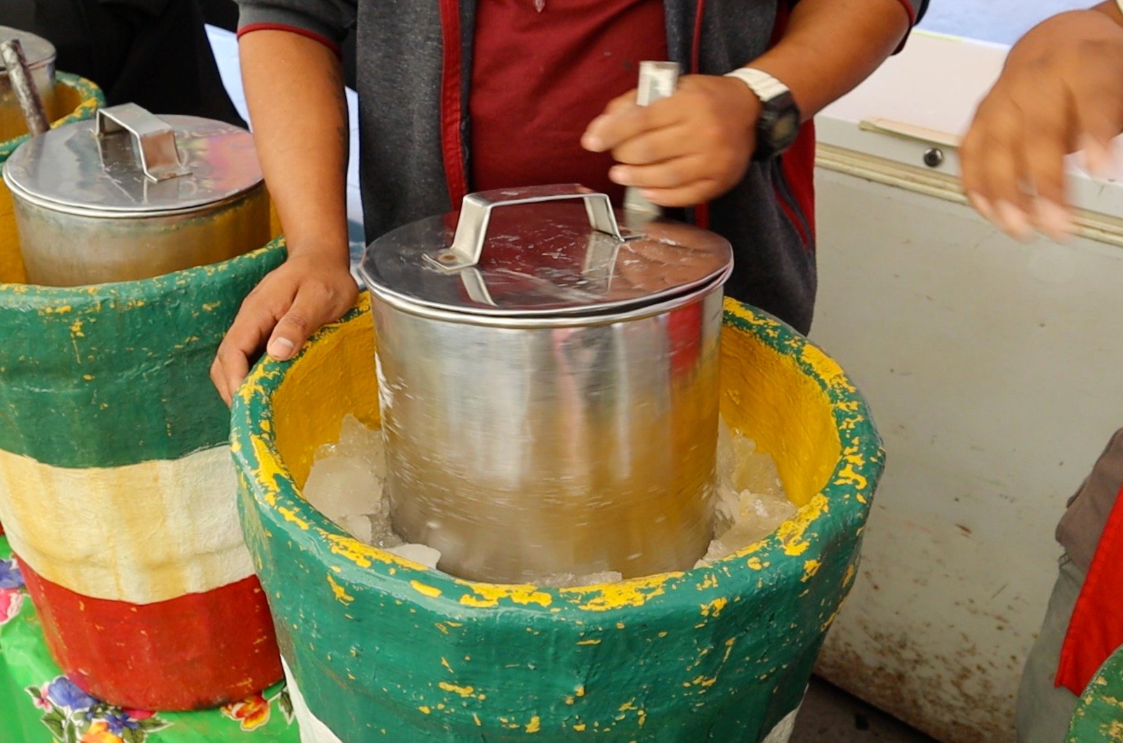 “Se tarda alrededor de una hora y media, dos horas. Por ejemplo, aquí le ponemos lo que es el hielo, la sal y ya le empezamos a dar vuelta. Ahí se va pegando la nieve. Por ejemplo lo que es la guanábana, lleva la pulpa de guanábana, le echamos azúcar y agua para llenar, pues el bote es de 20 litros.”(…)” “Ya tenemos alrededor de 20 años elaborando la nieve”(…)” Para cada nieve se lleva unos 12 litros, más aparte lo que es el azúcar, el hielo, la sal, para hacer un bote de nieve, más o menos son unos 300 a 500 pesos”, detalló.