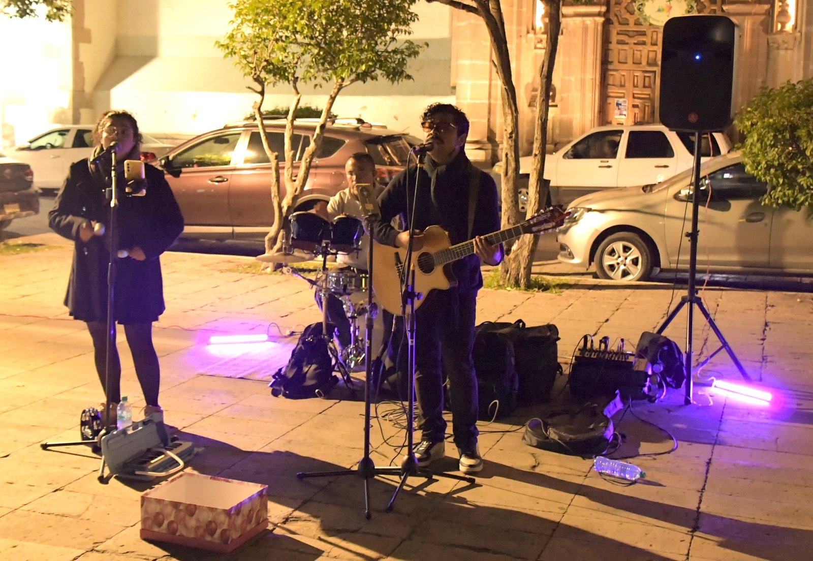 En medio de una noche fría de otoño novembrino y sobre la plancha del Jardín Hidalgo del Centro Histórico, el dueto conformado por Natalia Ceniceros y Saúl Sarmiento, quienes conforman Dos Gardenias, celebraron durante el pasado miércoles 26 de noviembre con música y buen ambiente, sus primeros nueve años de trayectoria artística.