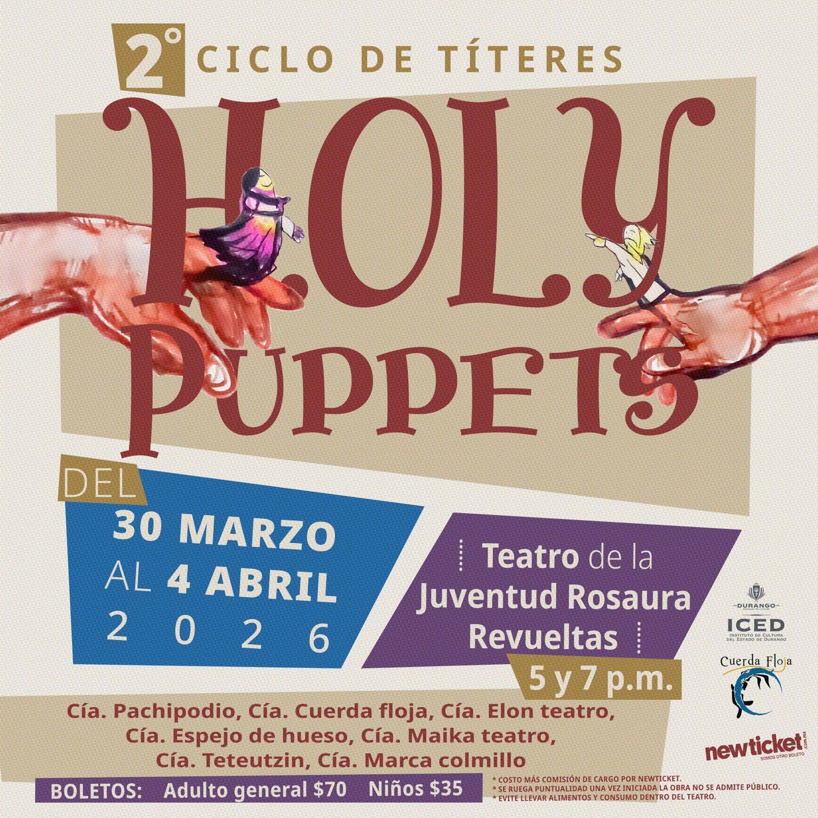 Por segunda ocasión, el Colectivo Cuerda Floja invita al públi familiar a disfrutar de las próximas vacaciones de semana santa para vivir con alegría y diversión el ciclo de títeres “Holy Puppets” que se llevará a cabo del 30 de marzo al 4 de abril en el Teatro de La Juventud “Rosaura Revueltas”, ubicado en el Parque Guadiana a un costado del Auditorio del Pueblo.